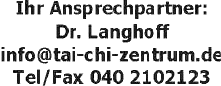 Wer sich zum Tai-Chi- & Qigong-Lehrer ausbilden lassen will - z. B. im Heimstudium mit DVDs als bequeme Vorbereitung -, kann sich gern an den Leiter der Ausbildung Dr. Langhoff in der Zentrale in Hamburg informieren: oder Fotos anschauen: Tai Chi Ausbildung Qigong-Ausbildung |